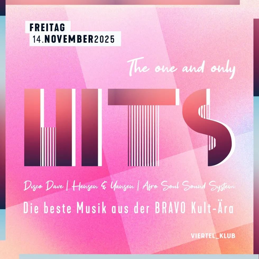 Mit der Novemberausgabe nimmt "HITS – the one and only!" wieder den gewohnten Platz im Programm des Viertel _Klub ein. Die beliebte Partyreihe gehört seit Eröffnung zum festen Bestandteil und erfreut sich ungebrochener Beliebtheit. Ganz nach dem Motto "Never change a winning team" sorgen auch diesmal Disco Dave, Hensen & Yansen sowie das Afro Soul Sound System für die passende Musik. Da trifft DJ Bobo auf die Spice Girls und Scooter gibt sich ein Stelldichein mit Eminem. Ausgelassene Hype-Stimmung garantiert.
