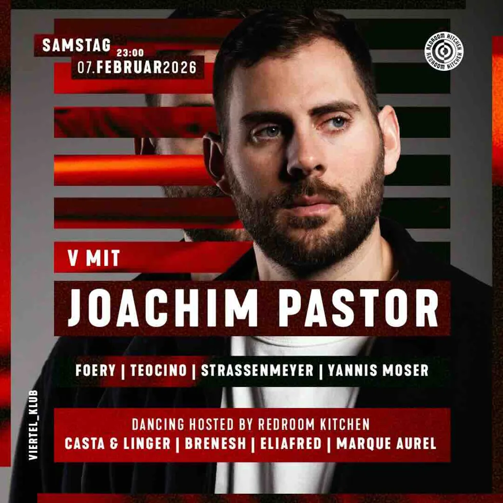 Schon mehrere Male begeisterte Joachim Pastor das Publikum in Basel, zuletzt an der Nightsession am Tension Festival. Nun ist er zurück im Viertel _Klub und gibt sein siebentes Stelldichein am Dreispitz. Seine Passion für Musik entdeckte Joachim Pastor schon als Vierjähriger, später absolvierte er ein klassisches Studium am Konservatorium und seit 2014 hat er sich voll und ganz der elektronischen Musik hingegeben... Nun freuen wir uns auf eine weitere, euphorische Nacht mit diesem Ausnahmekünstler. Support erhält der Franzose von Foery, Yannis Moser, Strassenmeyer und Robin Aebi. Das Dancing wird in dieser Nacht vom. Basler Imprint „RedRoom Kitchen“ gehosted. Am Start sind Linger & Casta, Brenesh, Eliafred und Marque Aurel.